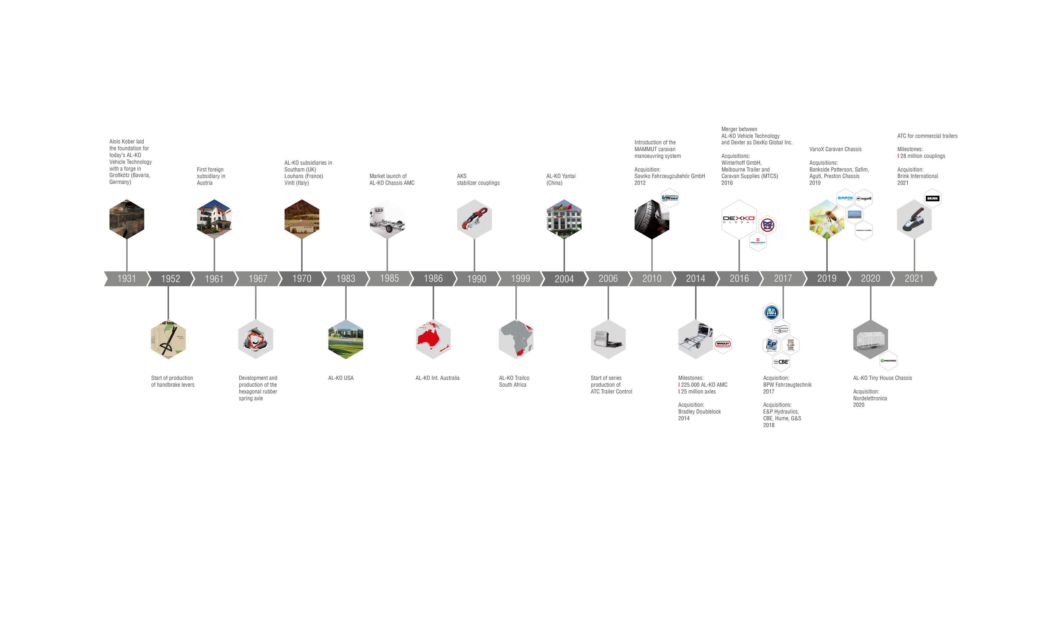 "Het is ongelooflijk hoe de AL-KO Vehicle Technology Group is gegroeid en zich heeft ontwikkeld. Als team hebben we een prestatie van formaat neergezet dankzij onze focus op onze klanten, partners en medewerkers, ons consistente financiële beleid gericht op stabiliteit, onze innovatiekracht en onze strategie om klanten alles op het gebied van chassis- en onderstelcomponenten uit één hand te kunnen bieden. Hiermee zullen we ons ook in de toekomst kunnen blijven onderscheiden", vervolgt Hiller. "Maar we willen verder groeien en daarom hebben we onlangs trekhaakspecialist Brink overgenomen, de grootste afzonderlijke acquisitie van DexKo wereldwijd tot op heden. Hiermee betreden we een volledig nieuw vakgebied. Nu al werken daar meer dan negenhonderd collega's, maar naar verwachting zullen we ons in deze sector verder versterken." Dat de AL-KO Vehicle Technology Group wereldwijd actief is, komt ook tot uiting in de productiecijfers: jaarlijks worden circa 700.000 assen en assystemen en ongeveer 100.000 chassisplatforms geproduceerd. Daarnaast zijn imposante mijlpalen bereikt als 28 miljoen geproduceerde aanhangerkoppelingen en 22 miljoen geproduceerde assen.